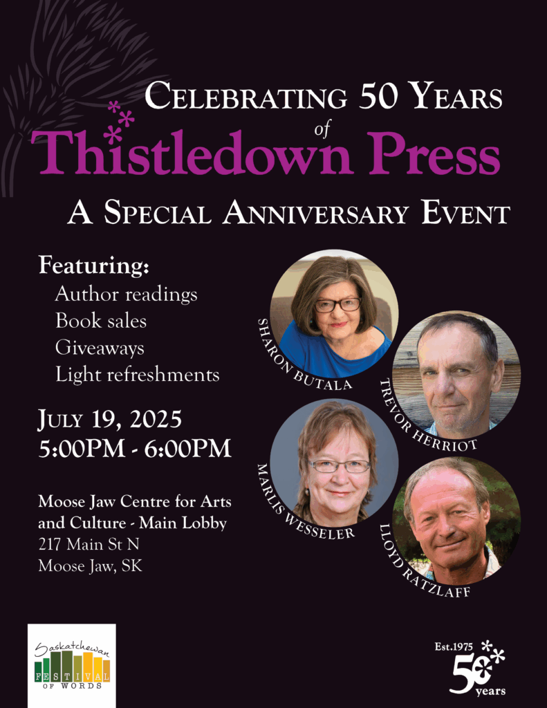 We are delighted to be featured in the 2025 Saskatchewan Festival of Words for our 50th Anniversary Celebration. Join us on July 19, 2025 for a memorable evening commemorating writing and publishing in Saskatchewan, with author readings, book sales, giveaways, and light refreshments. Featuring acclaimed Thistledown authors Marlis Wesseler (The Beech Forest, June 2024), Lloyd Ratzlaff (Walking Upstream, April 2025), Sharon Butala (Leaving Wisdom, May 2023), and Trevor Herriot (The Economy of Sparrows, September 2023), this is an event you won’t want to miss!
